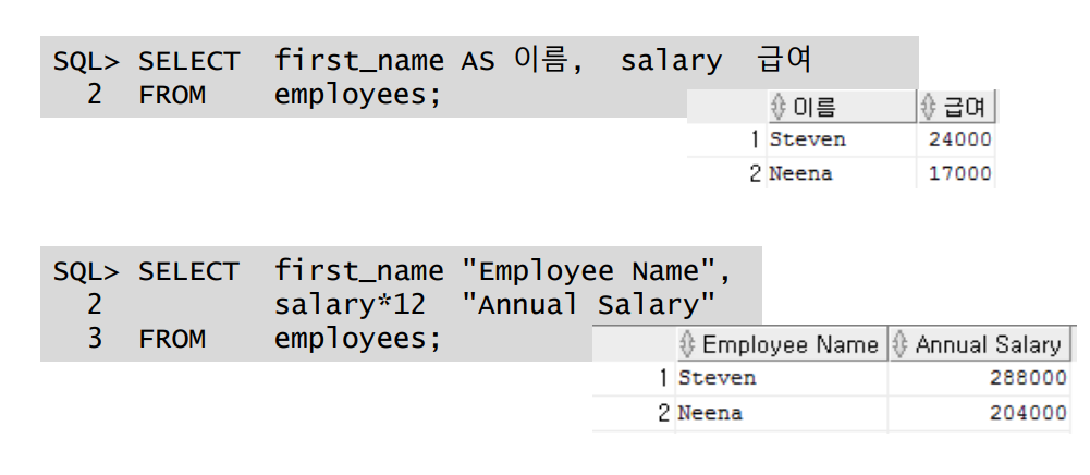 열 헤딩 이름을 변경합니다. 계산할 때에 유용합니다. 열 이름 바로 뒤에 둡니다. 열 이름과 별칭 사이에 키워드 ‘AS’를 넣기도 합니다. 공백이나 특수문자 또는 대/소문자가 있으며 이중 인용부호(“ ”)가 필요합니다.